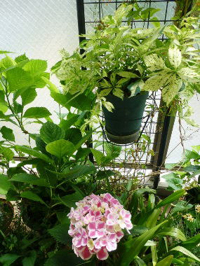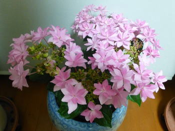 ピンクの紫陽花・・・「ダンスパーティー」と言う名前だそうです。 |