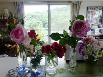 キッチンカウンターに並んだ花たち・・・