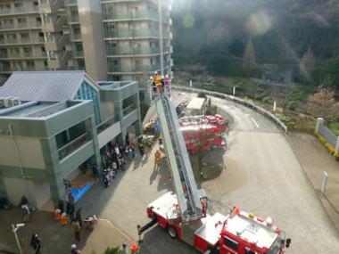 男の子がたくさん、集まっていて順番にはしご車に乗せてもらっています。