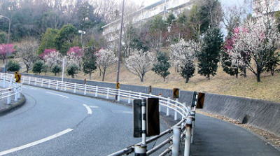 裏の駐車場を出たところの林の坂道を雪かきしている女性の方がいました。