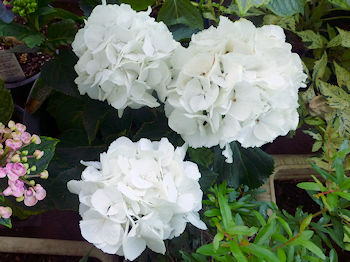 純白のアジサイは、今年買った小さな鉢植えです。美しく咲いています。 |