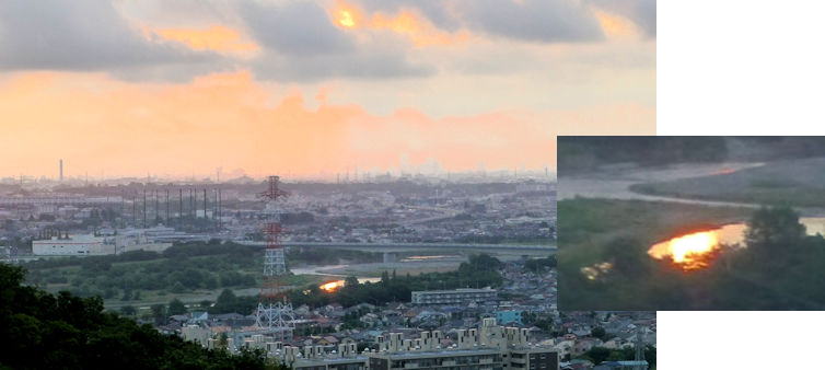 雲に隠れるとなぜか、くっきりと多摩川に太陽がうつっています。 |