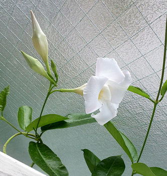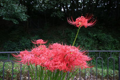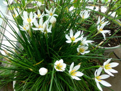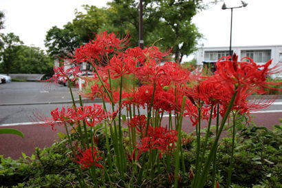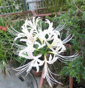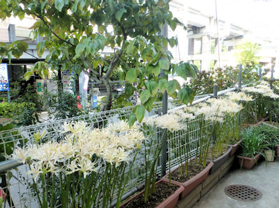 ↑ ホーム隣の学習塾の庭のプランターに植えられた白いネリネ、