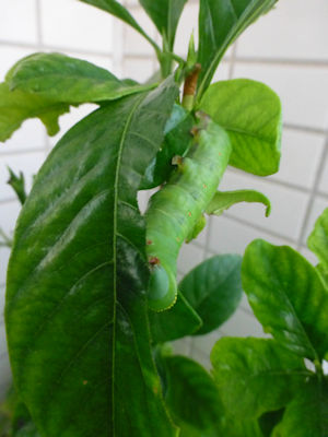 クチナシの鉢の根元にふんがいっぱい、蛾の幼虫がいるんだろうなと思い探したところ、