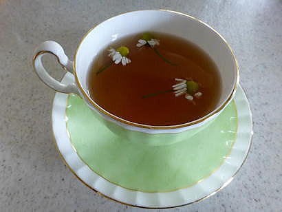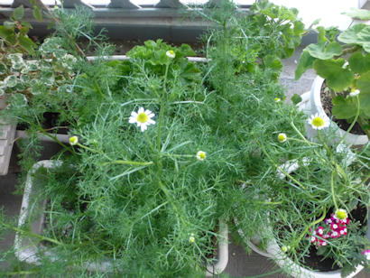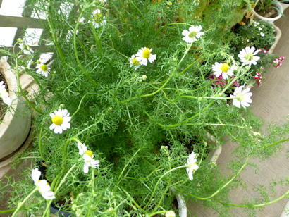 きれいな緑の葉と白い小さな花が かわいいカモミール、