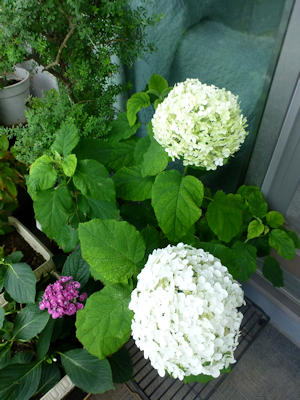少し咲いているカシワバアジサイ、アナベルの白がきれいです。