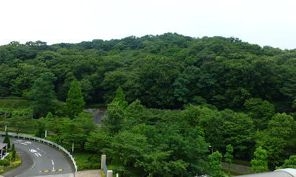 目の前の城山の濃い緑が