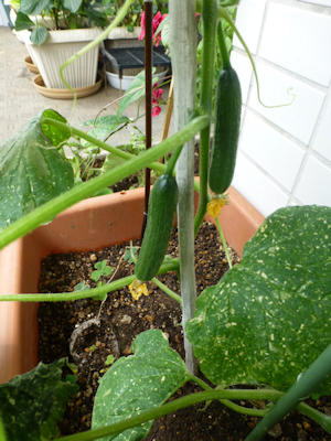 ミニキュウリもよく育っていて、まだまだ収穫できそうなので、ネットを張りました。