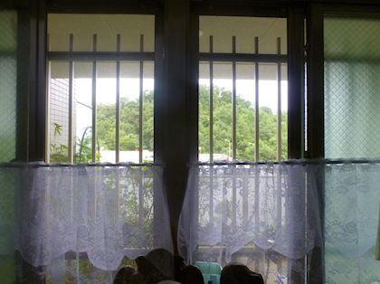窓の中は夫の書斎コーナーで、せっかく眺めが良い(城山と府中方面が見渡せる)ので