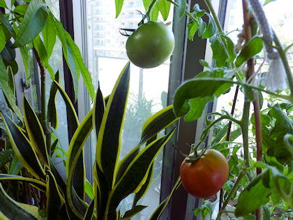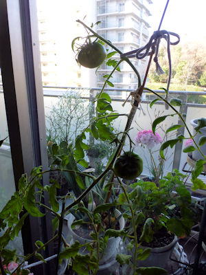 部屋に入れたトマト、なかなか赤くなりませんが、