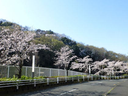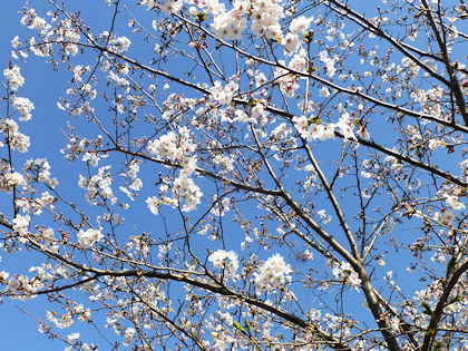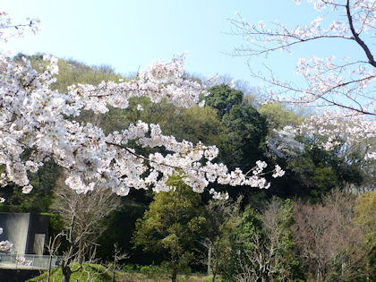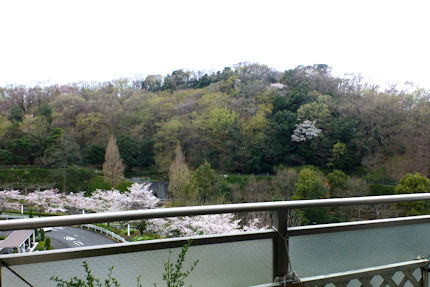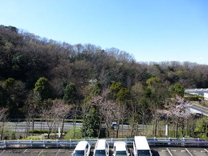 右は駐車上周りのサクラ、道路の向こうの城山に白く見えるのは、コブシです。 |