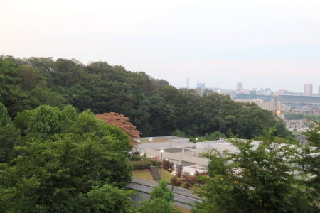 ネムノキの下に見える白い建物は