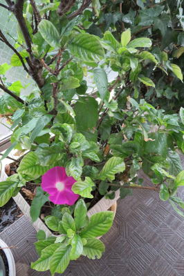 ↑ピンクの朝顔が、クチナシの根元に咲いています。去年の種からのようです。