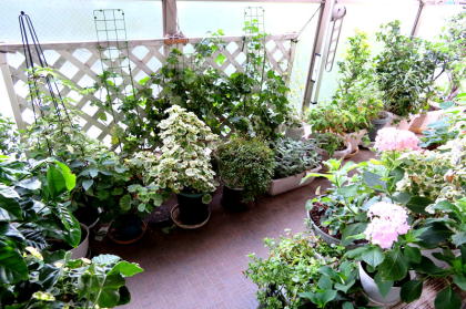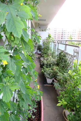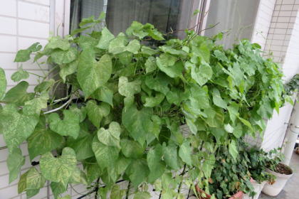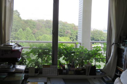 ↗ダイニング横の夫のデスクコーナーの前の窓際ですが、葉ばかり茂っています。