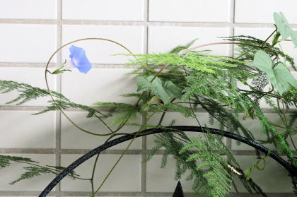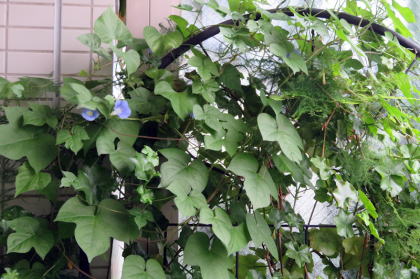 ↗ ユッカの鉢から、アサガオが芽を出し上のほうまで伸びて咲いています。