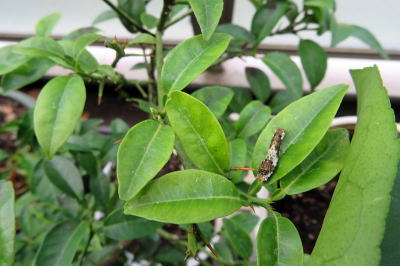 ↑2匹のアゲハの幼虫は、なかなか育たず、葉っぱを食べたあとも