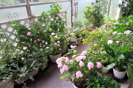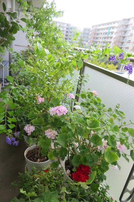アゲハのために、ポーチで咲いているデュランタやゼラニウムを