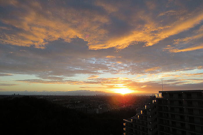 (1)14階の共用廊下から5:24分 (2)ポーチから5:33分 <今日の東京日の出 5:17分> |