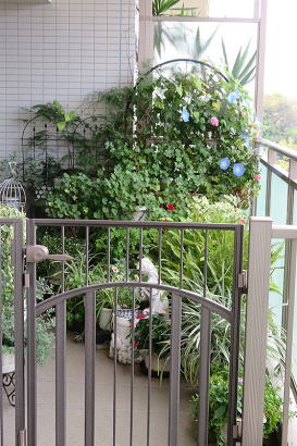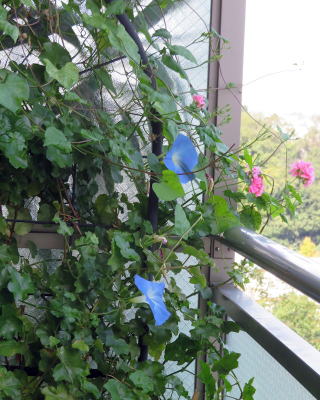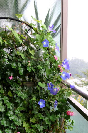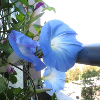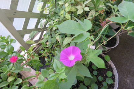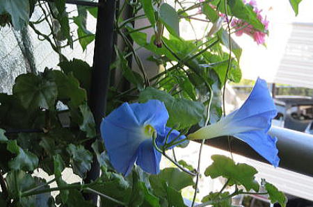 今年は 西洋アサガオのヘブンリーブルーの花が小さくて葉の間に隠れて見えない