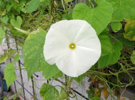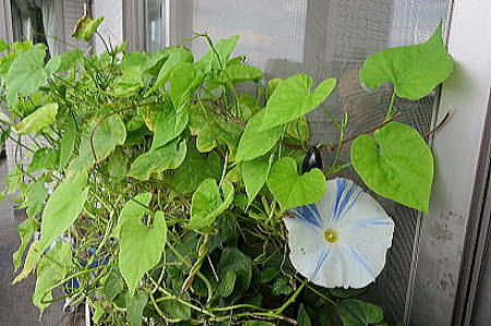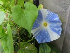 白にブルーの筋の入った西洋アサガオ(フライングソーサー)も葉ばかり茂って