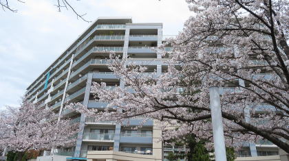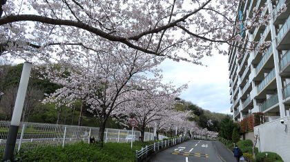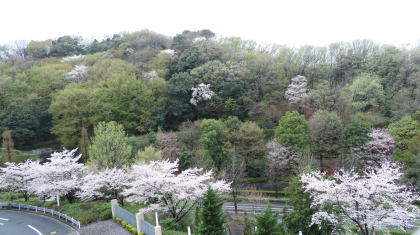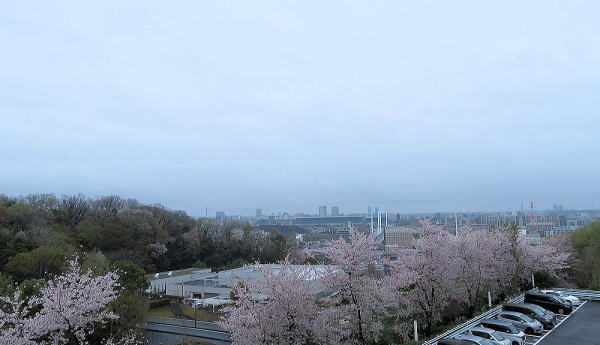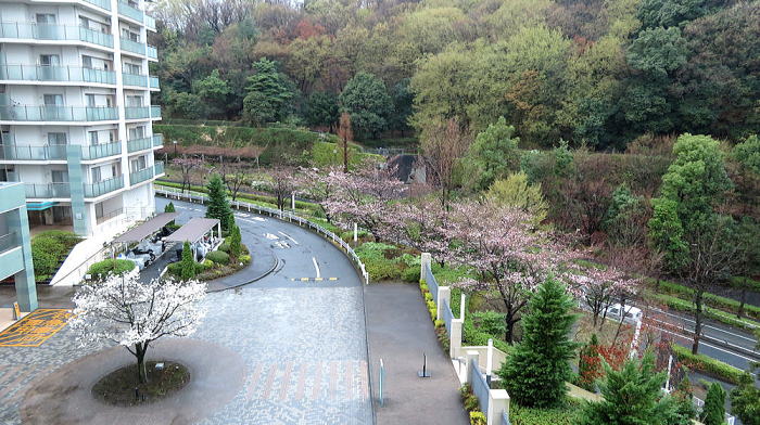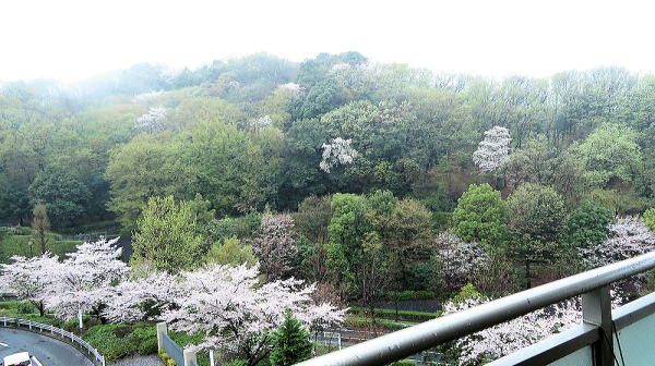 (1)ベランダから下を見るとコブシが満開、サクラも咲き始めています。