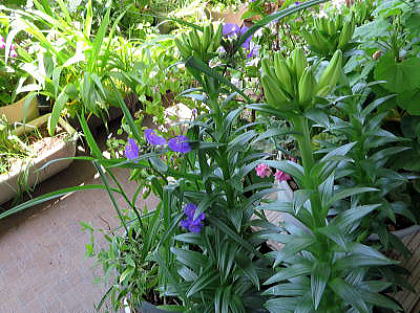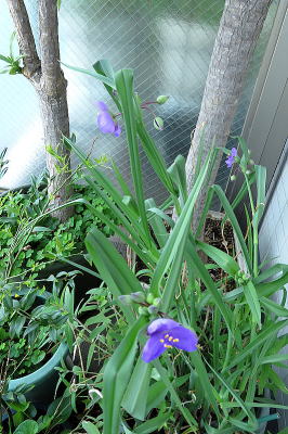 ↖↑オオムラサキツユクサが あちこちの鉢で