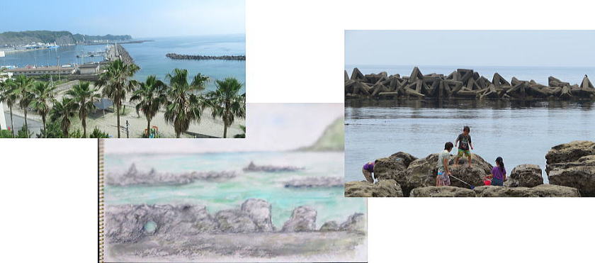 私は 船や漁港は描くの大変そうと、ホテルの前の海岸に行きました。
