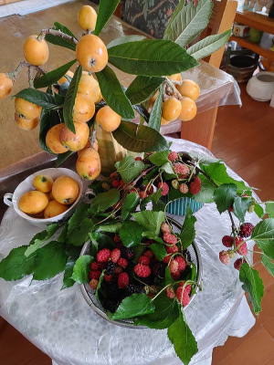 ↑先日、大阪の妹が 庭で採れた枝付きの枇杷とラズベリーを 送ってくれました。