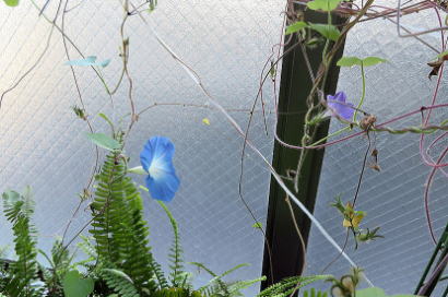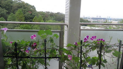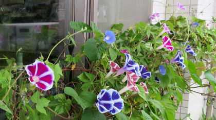 100円ショップで買った2色咲きのアサガオは、元気で次々咲いています。