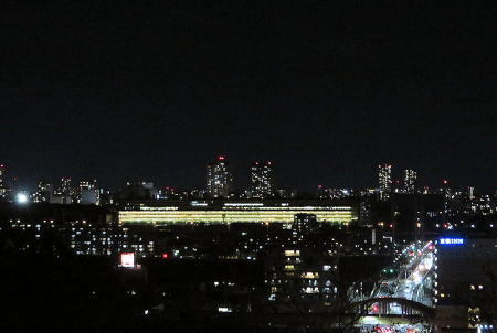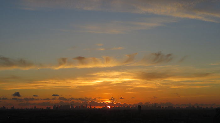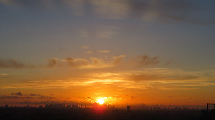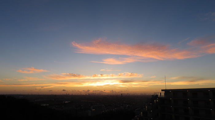 | ↓ 日の出(5時17分)(左の方にスカイツリー、右の方に東京タワー) |