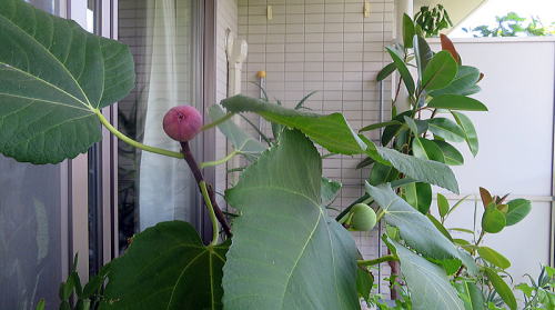 | ↑三個だけ実がなったイチジクです。ひとつだけ大分赤く熟してきました!! |