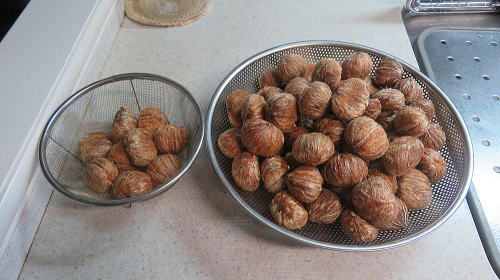 傷付けたもの(左側)は 渋皮も剥いて栗ご飯にします。