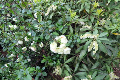 奥の方はアセビ、根元にはハナニラ、ムスカリ