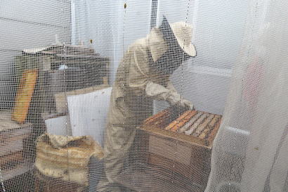 白いネットの中にミツバチがいます。