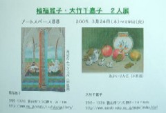 4人展 学生時代の美術部の友人4人で、初めての4人展を開きました。 2004年 4月12日(月)〜17日(土) たくさんの方に見ていただくことができました。ありがとうございました。 |
