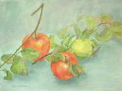 絵を描くものにとって、なんとなく絵心をそそる果物ってありませんか 私の場合、ぶどう かりん 洋なしです。 薄緑色がすきなのかもしれません。マスカットの色は 特に好きです。 青りんごも好きでしたが、最近はみかけなくなりました。 りんごの形もインドりんごとかスターキングとか面白い形のものがあったのですが、 今では、みんなまん丸になってしまいました。 お店で、葉っぱのついた果物をみつけると嬉しくなり、大事に買って帰ります。 新鮮な枝付き葉つきの果物が手に入ると、描かなくちゃという 気持になります 最も作品になるのは、そのうちどれくらいかなー。 (2002.2) |