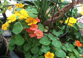 ナスタチウムはアブラムシを遠ざけるので、アブラムシを好む植物と混植させるとよい。