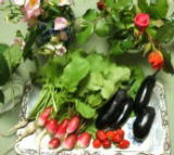 6月8日(水) 6月に入ってから、なるべく一日に一回は表に出ようと決心。(いつまで続くか わかりませんが、目的は運動不足解消です) 今日も、特に出かけるところもないので、夕方、畑に行き、花や野菜を収穫して きました。 ←あかかぶとナス(初収穫)、 いちご、 色々なバラ、桃色月見草、カモミール、ミント |