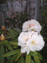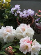 4月14日 後ろの薄紫色の花は、ブルーしゃくなげということで、買いましたが、つつじと しゃくなげの交配種だそうです。株は、あまり大きくなりませんでしたが、 今年も奇麗に咲きました。(クレーターレーク) 手前のしゃくなげは、健康飲料のポイントサービスで蕾がついているものを もらったのですが、淡いピンクから白に変わる大きな花で とても華やかです。 (西洋シャクナゲ 真珠姫) |