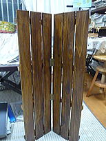 先日買っておいた風呂場用のすのこを、のこぎりで二つに切り ちょうつがいでとめて塗料を塗りました。