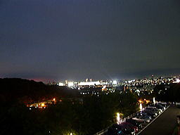 花火大会でした。 夜、競馬場で行事があるときは、ライトが明るく付いています。(中央の白く光っている建物)
