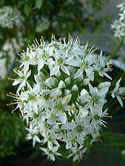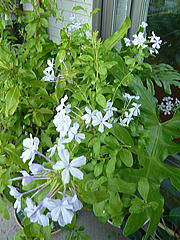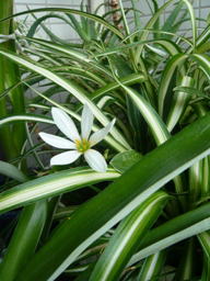 純白の花が美しい。オリヅルランと寄せ植えしてあります。