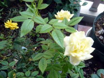 白いバラが一輪と黄色いミニバラが咲いています。 |
