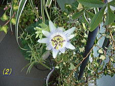 (2)トケイソウがぽつぽつと咲いています(3)のフクシャの後ろのトレリスに絡ませてあります。