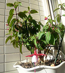 今、ベランダで咲いている花は、シャコバサボテン、ビオラ、フクシャ、ゼラニウム、アロエ、ベゴニア,