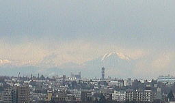 南武線で、多摩川をわたるとき、遠くの山並みが青く輝き、ところどころ白い雪に覆われ、きれいでした。