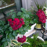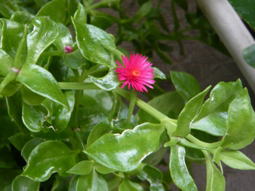 緑ばかりの中に、少しだけ咲く濃いエンジ色のアイビーゼラニウムが