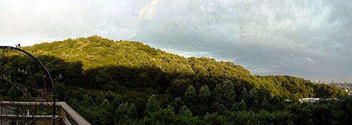 リビング前の城山公園が朝日に輝いていましたが、急に曇り6時頃お天気雨の様なにわか雨。
