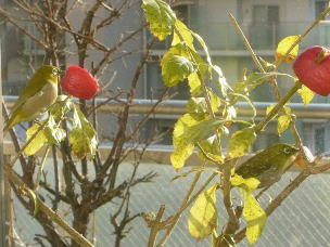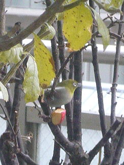 昨日、夫が「メジロらしい鳥が来ていた」というので、今日リンゴをきって、
