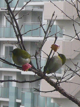 ユスラウメの枝に刺しておきました。夕方、メジロが一羽現れました。